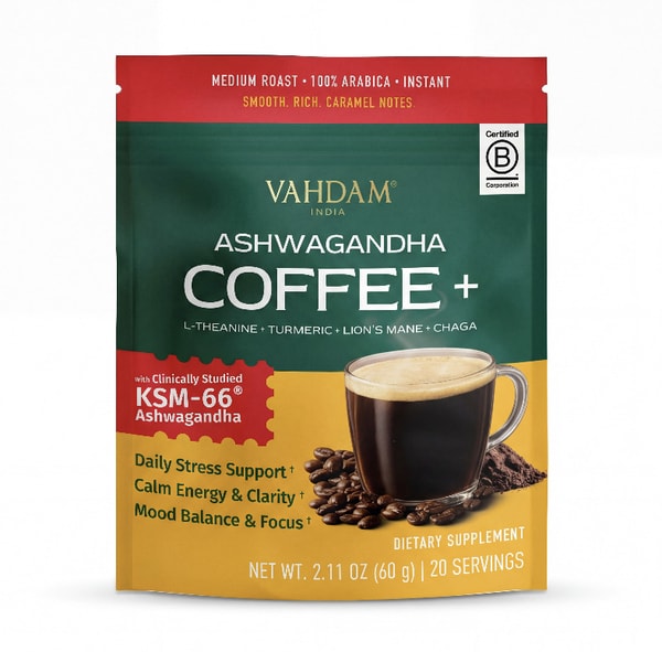 VAHDAM's Ashwagandha Coffee blends 100% premium Arabica coffee with KSM-66 Ashwagandha, L-Theanine, Lion's Mane, Turmeric Curcuminoids, and Chaga. This results in a functional beverage designed to provide steady energy and focus while supporting stress resilience without the jitters commonly associated with regular coffee. The inclusion of clinically proven adaptogens and functional mushrooms means a single cup can potentially address multiple goals simultaneously, such as reducing stress, sharpening mental clarity, and supporting immune health.