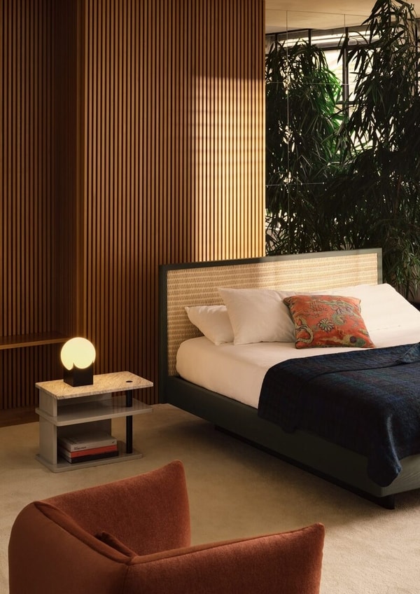 The AWASE bed by Omi Tahara for Bolzan is a bed frame design that applies principles of traditional Japanese joinery to a contemporary furniture piece. The frame is constructed from solid timber components that interlock without the use of metal fasteners, creating a continuous visual line along the headboard and side rails. The design emphasises the precision of wood connections and the clarity of form inherent in traditional woodworking techniques.