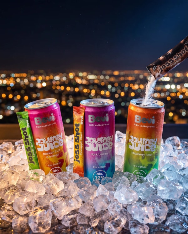 Cans of ready-to-drink take the form of vodka-based, lightly carbonated, fruit-forward beverages for pre-night-out gatherings. Joss Shots, packed in sachets, are effervescent and made to be poured into an alcoholic drink to provide a boost from caffeine, taurine and other energizing ingredients.