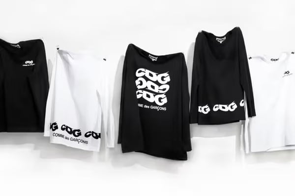 The oversized version shifts the graphic approach with a stacked arrangement of warped logos across the front. The central print is inverted, creating contrast between the top and bottom elements within the same composition. The collection is produced in a monochromatic palette of black and white and is available through CDG flagship locations and the brand’s official web store.