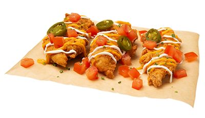 Chachos are essentially a fried chicken version of nachos. However, instead of tortilla chips, the Chachos are made with KFC's Original Recipe chicken tenders. The crispy chicken is then topped with nacho cheese sauce, sliced jalapenos, diced tomatoes, sour cream, and chives—just like traditional nachos.