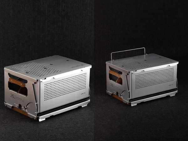The Unito Container 26L is a modular storage box designed for outdoor and everyday use, combining anodized aluminum construction with teak wood detailing. The unit offers 26 liters of storage and includes features such as a removable divider, perforated panels for airflow, and integrated carry handles. Teak side handles contrast with the metallic body, while the perforated aluminum structure allows ventilation for items sensitive to heat or moisture. The design supports stacking, with each container maintaining independent access when paired.