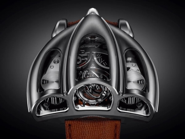 The case follows a streamlined form referencing early automotive design, with surfaces shaped to wrap around the exposed movement. The triple-axis tourbillon sits at the center and rotates across three axes to regulate timekeeping precision. The movement operates at 3Hz and is hand-wound, with a 45-hour power reserve. German silver is used for the mainplate and bridges, supporting structural rigidity and traditional finishing.