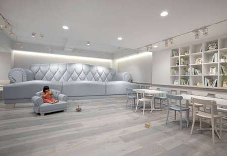 Designed by Japan designers Nendo, the Baby Cafe offers books, toys, a playroom and even areas for nursing and changing diapers. According to Dezeen, because the Baby Cafe is to be enjoyed by different "sizes of users"--meaning the parents and children--the interior design plays on scale and proportion: big and small windows placed together, varying sizes of floorboards, and enormous sofas that function as kids' play areas.