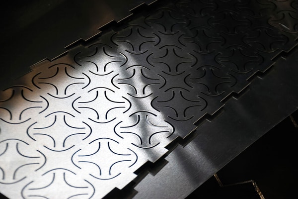 When illuminated, the panels act as both diffuser and lens, casting shifting light patterns across surrounding surfaces. The aluminum retains visible marks from the forming process, including grain direction and subtle irregularities created during fabrication. These surface conditions remain present in the final object, alongside the cut patterns that define how light passes through each panel. The project was completed in 2025 by a team specializing in computational design and robotic fabrication.