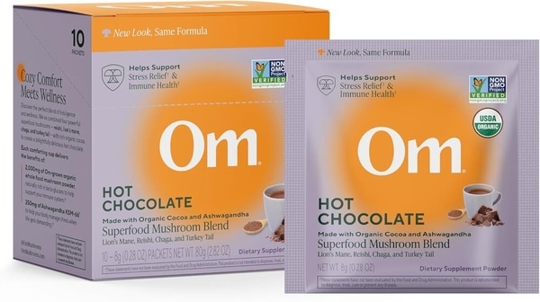 Each single-serve packet of OM MUSHROOM SUPERFOOD’s Dutch Cocoa Mushroom Powder Hot Chocolate Blend contains 2000 milligrams of whole food mushroom powder and 400 milligrams of beta-glucan. Simultaneously, the company keeps sugar at just two grams and calories at 25 per serving.