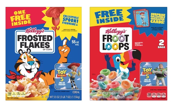 The partnership between Ferrero's W.K. Kellogg brand, Disney and Pixar is seeing a series of special edition cereal boxes with retro-style branding headed to the market. These cereals are each paired with surprise toys inside that are each themed with Toy Story 5 to help catch the attention of avid fans as well as Millennial parents who grew up with cereals with surprise toys inside. The cereals include such classics as Frosted Flakes and Froot Loops, and will start hitting store shelves April 26 ahead of the release of Toy Story 5 into theaters June 19, 2026.