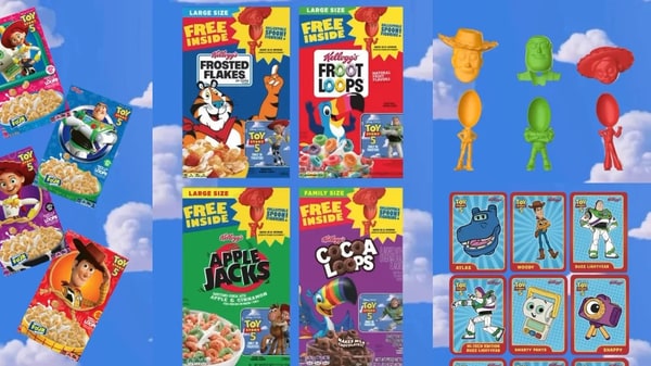 The campaign is positioned as a revival of a once-common cereal format that paired breakfast products with collectible items. Packaging features Toy Story 5-themed graphics and "Free Inside" labeling to indicate included items. Select boxes also integrate promotional tie-ins such as movie ticket offers, extending the campaign beyond physical inserts. It all emphasizes character-driven visuals across different cereal variants.