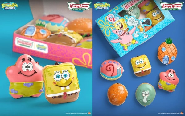 Krispy Kreme SpongeBob doughnuts introduce a themed collection inspired by characters and locations from the animated series. The lineup includes designs based on SpongeBob SquarePants, Patrick Star, Squidward Tentacles, Gary the Snail, and SpongeBob’s Pineapple House, alongside a doughnut styled to resemble the Krabby Patty. Each piece is decorated with colored icing, piped details, and character-specific toppings, translating familiar cartoon visuals into edible formats. The assortment is typically packaged as a full set, allowing all designs to be presented together in a single box.