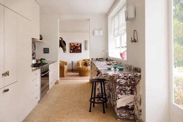 The interiors combine restored heritage elements such as moulded ceilings, fireplaces, and timber floors with new insertions including terracotta tiles, marble surfaces, and custom joinery. A rear courtyard was raised to align with the interior floor, extending the living space outward and improving the connection between inside and outside. The materials are layered across rooms through stone, timber, and metal detailing, with vintage furniture and artwork integrated into the spaces.