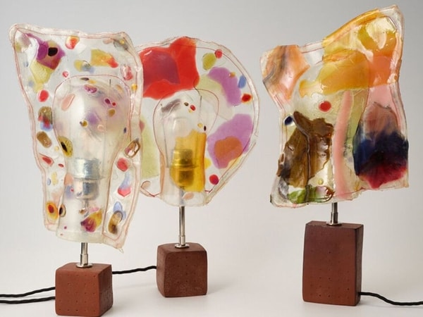 Marten Herma Anderson’s resin lamps are based on a childhood moment where candy melted onto a lightbulb, forming irregular translucent layers. The lamps are produced by casting pigmented resin directly around the bulb, allowing the material to settle and cure into uneven, layered surfaces. This process creates visible shifts in color density, with some sections appearing more saturated while others diffuse light more softly when illuminated.