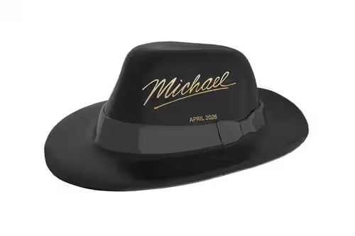 The Cinemark Michael Black Hat popcorn bucket presents a collectible container shaped after the signature fedora associated with Michael Jackson. The design features a matte black molded form with a structured brim and crown, translating the silhouette of the hat into a functional vessel. Gold script lettering referencing the Michael film appears across the front, with additional detailing integrated into the band that wraps around the base. The interior is fully hollowed to hold popcorn, maintaining a standard concession format within a sculptural exterior.