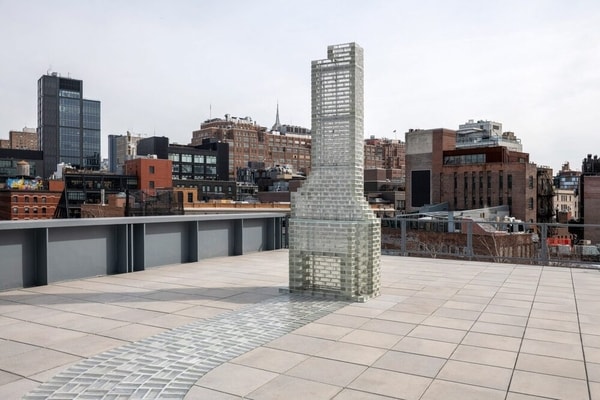 The Monument (Altadena) is a large-scale installation by Kelly Akashi presented at the Whitney Museum of American Art as part of the 2026 Biennial. The work takes the form of a tall chimney built from clear glass bricks, alongside a matching walkway, referencing the only structure left standing after the artist’s home and studio were destroyed in a 2025 wildfire. Monument (Altadena) recreates that original chimney at full scale, translating it into a translucent, light-responsive material.