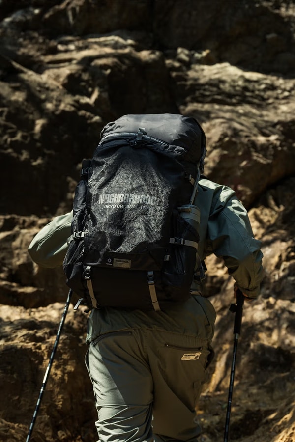 The lineup includes collaborative products such as footwear, caps, and backpacks developed with partner brands, alongside standalone items like a folding umbrella and compact equipment. Garments feature utility-driven details including adjustable fastenings, multiple pockets, and reinforced construction points. The collection maintains NEIGHBORHOOD’s established utilitarian aesthetic while adapting it to performance-focused contexts, combining structured silhouettes with materials suited for outdoor wear.
