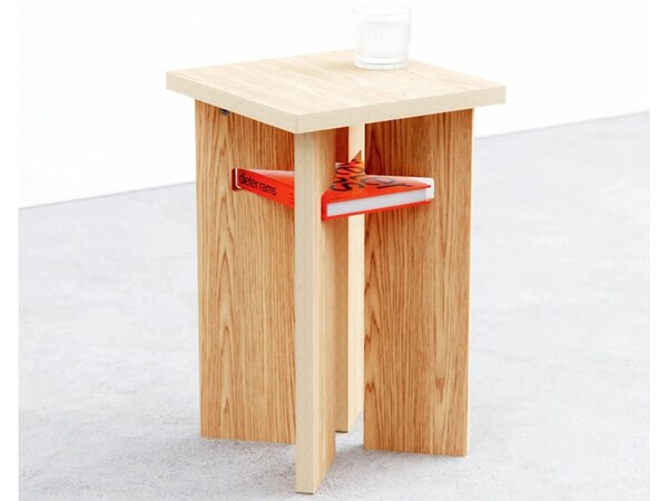The table is constructed from solid wood, with a pared-back form that emphasizes proportion and material. The notch is precisely dimensioned to fit standard book sizes, creating a fixed function rather than adjustable storage. Its geometry relies on clean intersections and subtle spacing to maintain stability while supporting the integrated slot. The design uses subtraction as its primary gesture, removing material to define both structure and utility within a compact footprint.