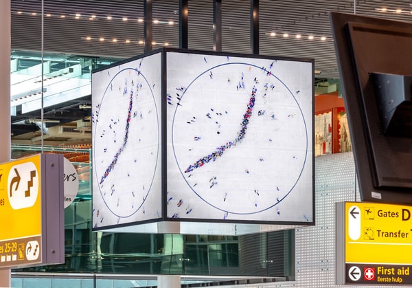Maarten Baas’s People’s Clock at Amsterdam Schiphol Airport is installed in Lounge 1 as part of his ongoing Real Time series. The work replaces a traditional clock face with a large cube structure containing synchronized video screens. Each screen displays a continuous 12-hour recording in which groups of people move in coordinated formations to form the hour and minute hands, while a single performer runs along the edge to mark seconds.
