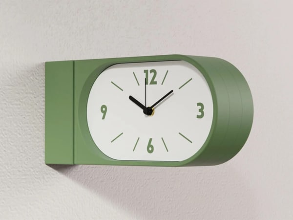 The structure uses a central support arm with two opposing clock faces housed in a compact circular form. Each side operates simultaneously and remains visible from different angles, supporting use in hallways, entryways, and open-plan interiors. The clock runs on two AA batteries and can be lifted off its mount for maintenance without tools. The design uses a minimal face with clear markers and a restrained color palette offered in three variations.