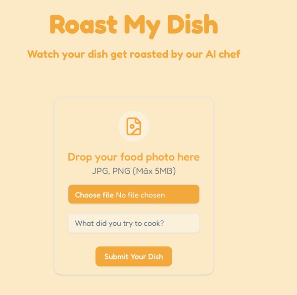 Roast My Dish is a web-based application that uses artificial intelligence to analyse uploaded food images and generate humorous, critical commentary. Users submit a photo of a dish, and the system produces a "roast" alongside a suggested recipe intended to improve the outcome.