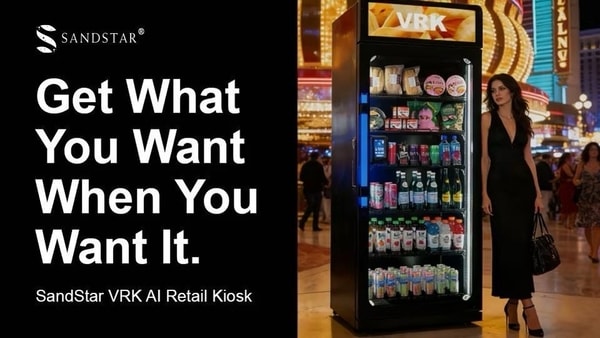 SandStar launched the SandStar VRK, a standalone vending kiosk built around AI computer vision designed to modernize unattended retail. Featuring a matte-black shell and four-camera protection, the VRK uses a self-learning AI engine that adapts from the first transaction onward to improve product recognition and accuracy.