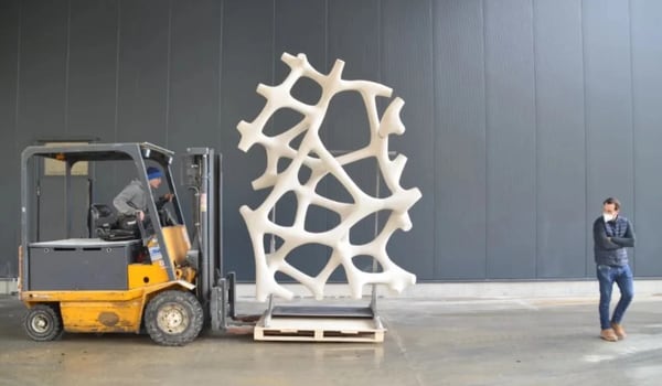 Autodesk Research and Additive Tectonics introduced a 3D-printed floor system that combines permanent printed formwork with alternative materials, featuring econitWood upcycled wood-mineral formwork and a potassium-activated geopolymer mortar. The project used Selective Cement Activation (SCA), a particle-bed process that binds dry mineral powder in layers, designed and analyzed with Autodesk Inventor Nastran to optimize ribbed geometry.