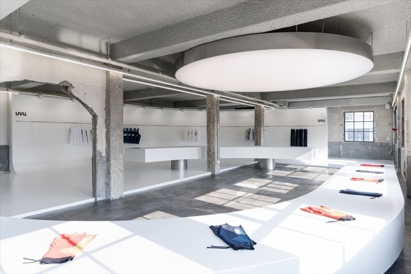 UVU opened its first permanent flagship store in Seoul’s Seongsu district, created with London studio two-fold and featuring a reused industrial shell with a signature inserted curved wall that displays apparel on a single rail. The two-level, 400 sqm space keeps original concrete and brick while introducing white-dipped flooring and a light-filled retail floor one level up with a reception/event ground floor and multimedia installation at the entrance.