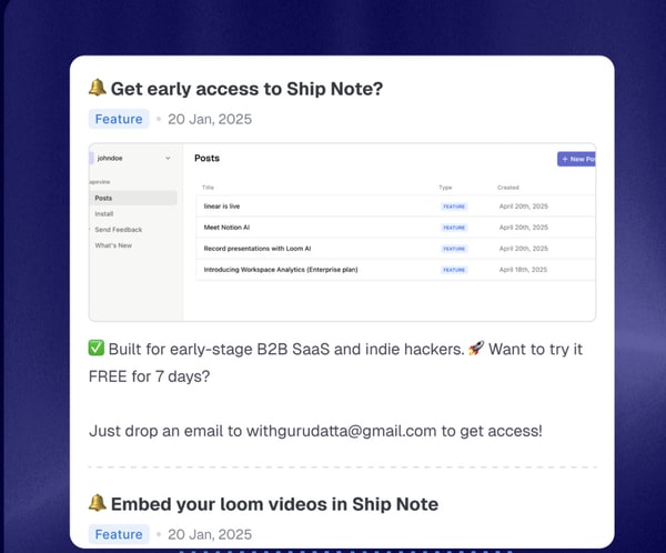 Ship Note is a product communication tool designed to help teams announce updates directly within their applications. It provides an embeddable widget that displays feature releases, improvements, and other product news inside the user interface, reducing reliance on external emails or separate release pages.