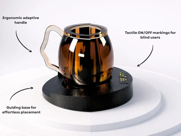 This Smart Cup for Visually Impaired Users is an all-in-one vessel that combines the functions of a kettle, teapot, and drinking cup into a single object. Designed by Ivana Nedeljkovska, the product eliminates the need to pour hot water between containers, reducing risk for blind and visually impaired users. Smart Cup for Visually Impaired Users is built to be operated entirely through touch, with tactile controls and Braille ON/OFF markings that allow independent use without visual feedback.