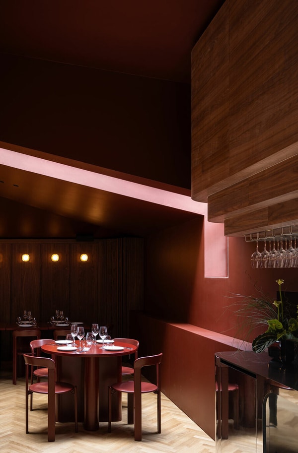 TABRA by Andreea Cornila presents a restaurant interior built around saturated color, controlled lighting, and spatial contrast. TABRA by Andreea Cornila centers a burgundy-drenched palette applied across walls, ceilings, seating, and drapery, forming a continuous visual field throughout the space. A singular skylight introduces a focused beam of natural light, while small circular wall fixtures provide diffused illumination that interacts with glossy tables and textured upholstery.