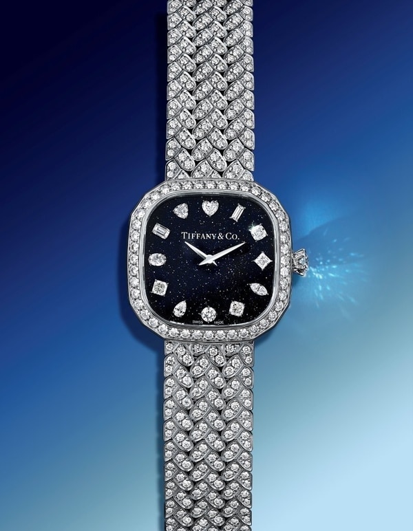 The extravagant Eternity dial boasts 12 hand-set diamonds at the hour markers, each cut in a unique shape — from round brilliant, baguette, cushion, Tiffany True, marquise, and Asscher to heart, pear, oval, emerald, triangle, and princess. Tiffany & Co. placed the heart-shaped diamond at the 12-hour marker as a symbol of love.