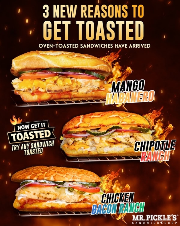 Designed to offer consumers a new way to enjoy the brand's premium sandwiches, Mr. Pickle’s new toasted sandwich lineup pairs flavorful ingredients with signature sauces. The new lineup includes three bold flavor options, Chipotle Ranch, Chicken Bacon Ranch, and Mango Habanero, each of which can be enjoyed on a variety of Mr. Pickle’s signature breads. While all of the new flavors are making their debut with chicken, guests can also order any of their favorite Mr. Pickle’s sandwiches "Now Toasted" for a fun twist on their go-to order. As Mike Nelson, CEO of Mr. Pickle’s Sandwich Shop, explains, "Toasting adds a whole new dimension of flavor and texture to our sandwiches."