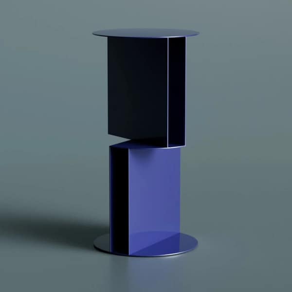 The Torque High Side Table by Deniz Aktay eliminates conventional legs by using two metal storage volumes as the primary structural system. Instead of a base or frame, the table is supported by these open compartments, which are stacked and rotated against each other to create both balance and visual tension. A circular top rests above the upper unit, while a matching disc at the bottom stabilizes the form, with everything in between functioning as either storage or support.