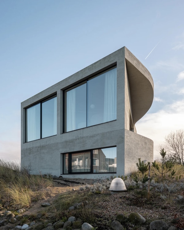 Villa Nouvelle Vague by Magalie Munters is a seaside residence in Oostduinkerke, Belgium, designed as a continuous concrete form shaped by its surrounding dune landscape. The project was developed by Belgian architect Magalie Munters and positions the structure within a protected coastal site. The villa’s exterior features a horizontally striated concrete surface that directly references the patterns left by receding tides, translating environmental conditions into built material.