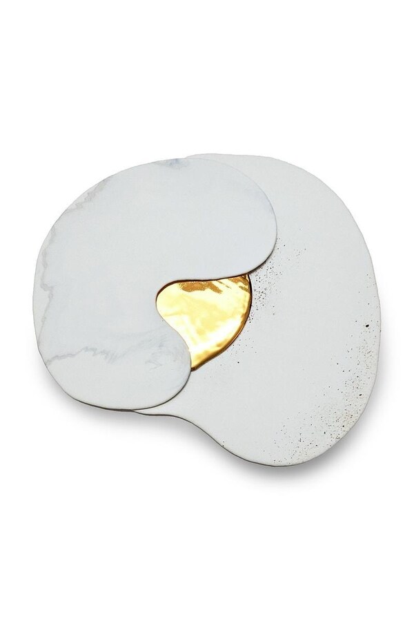 Haven represents a collection of ten different wall elements created through a playful approach to traditional slipcasting techniques. The delicate and luxurious wall objects capture attention with the softly shimmering gold plating at their centers and a sensuous, filigree allure that allows for freely composable formations.