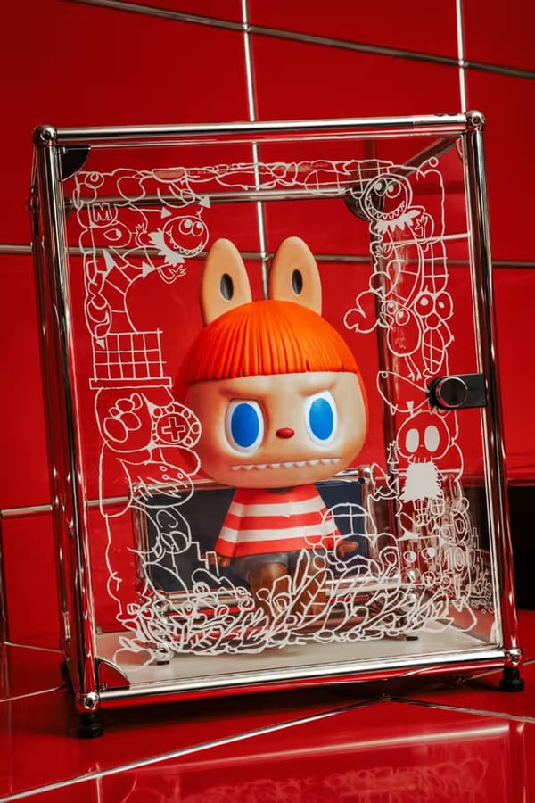 The artful project includes a limited-edition collectible titled "Beautiful Thing!," consisting of a USM glass display cabinet containing a co-branded Labubu figure and a mini seat. The furniture system retains USM’s modular steel structure while incorporating printed panels featuring Lung’s artwork. The exhibition combines modular furniture components with illustrated surfaces and collectible elements, with distribution supported by partners including Lane Crawford and How2Work.