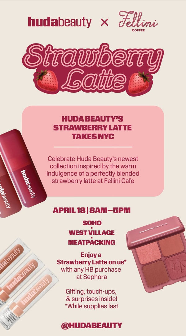 Huda Beauty’s Y2K cafe pop-ups spotlight a growing shift toward experiential product launches that blend beauty with everyday lifestyle spaces. To promote its Strawberry Latte Collection, the brand is transforming select Fellini Cafe locations in New York City into immersive, themed environments that merge coffee culture with cosmetics.
