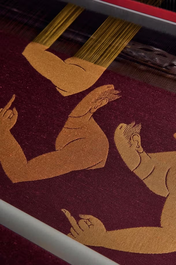 The exhibition includes a sculptural sofa upholstered in silk based on the artist’s sketches, alongside additional rooms displaying archival references and textile pieces linking Chinese and Venetian silk traditions. A separate section presents the “Finger” motif within the woven works, while a documentary film by Felipe Sanguinetti documents the development process behind the collaboration. The installation is on view at Rubelli’s Via Fatebenefratelli showroom in Milan through mid-May 2026.