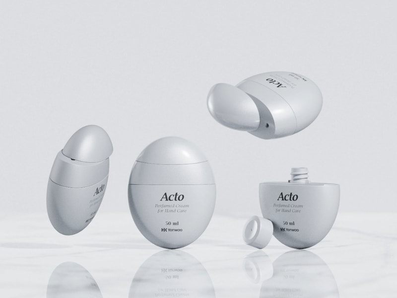 Yonwoo introduced the Acto cosmetic pack designed for one-handed use featuring a thumb-swipe closure that releases product with a single gesture.