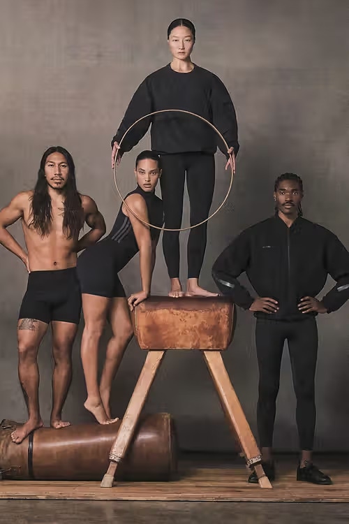 The collection includes garments from adidas performance lines such as Optimé, Z.N.E., and D4T, reworked with oversized proportions and structured fits. Pieces include training onesies, leggings, bras, tanks, and outerwear, alongside footwear like the Lightblaze POD and Ace silhouettes. Materials follow technical sportswear construction, with stretch fabrics and layered systems suited for movement across different activities. The drop maintains a uniform color direction, applying black across all categories to emphasize form and proportion.