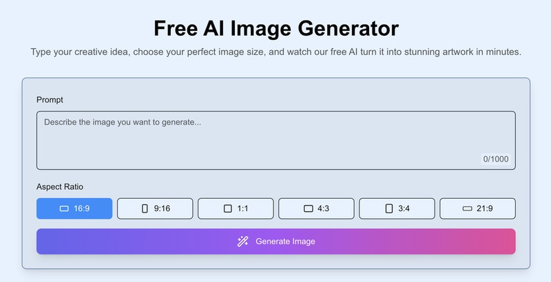 AImageGen is a web-based AI image generation tool that converts text prompts into visual outputs. It allows users to create digital artwork by describing desired scenes, styles, or concepts, which the system then interprets into generated images. The platform is positioned as a free-to-use service with no login requirement and no stated usage limits, making it accessible for casual and exploratory creative use.