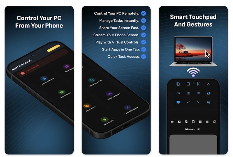 Any Command is a remote control application that enables users to manage a personal computer from a mobile device. It provides functionality such as wireless touchpad and mouse control, full keyboard input, screen sharing, and file transfer capabilities.
