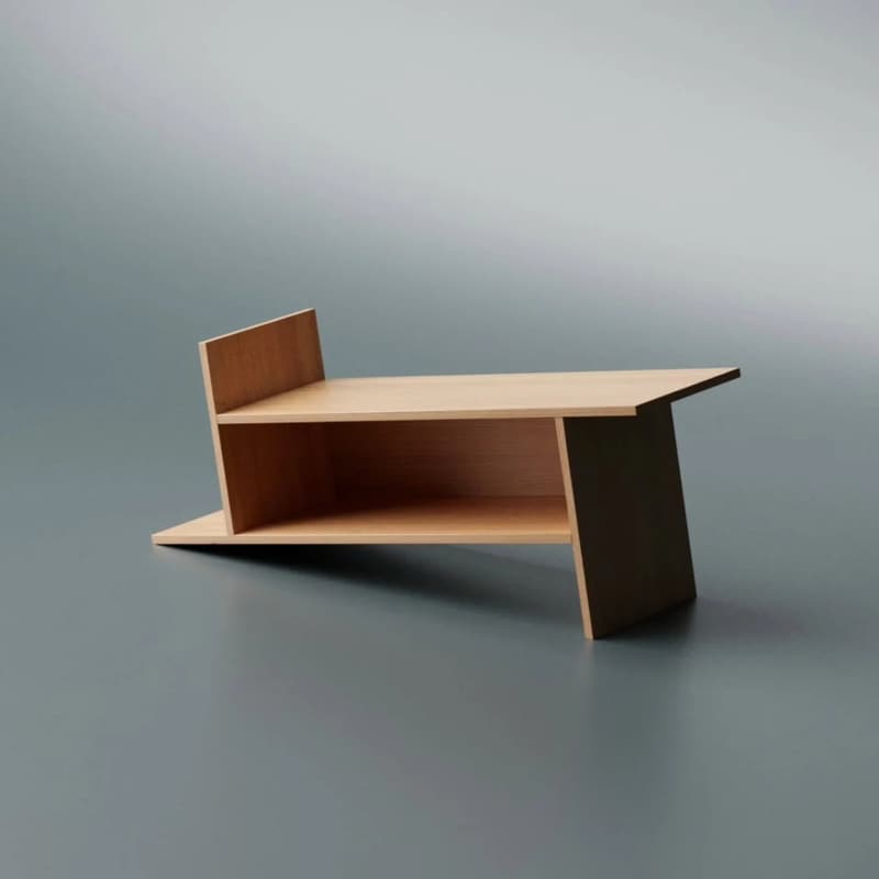 The Barrow bookrack by Deniz Aktay is a freestanding storage piece developed from a simple geometric operation that extends the lines of a rectangle into three dimensions. The design was created by German designer Deniz Aktay and translates a flat graphic concept into a functional wooden object. The structure appears tilted and asymmetrical, with extended edges forming multiple surfaces for storing books and objects.