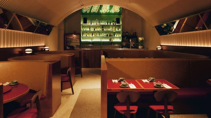 Cafe Kowloon is a Cantonese restaurant in East London designed by Daytrip Studio for hospitality group 6 of 1, located beneath railway arches on Mentmore Terrace. The interior draws on Hong Kong’s cha chaan teng cafés and street food stalls, translating their dense, high-energy environments into a layered dining space. The layout is split into two zones, with a noodle bar at the entrance leading into the main restaurant. Materials include stainless steel counters, maroon tiles, timber, leather, and industrial grating, combined with neon lighting and mosaic surfaces to build a textured setting.