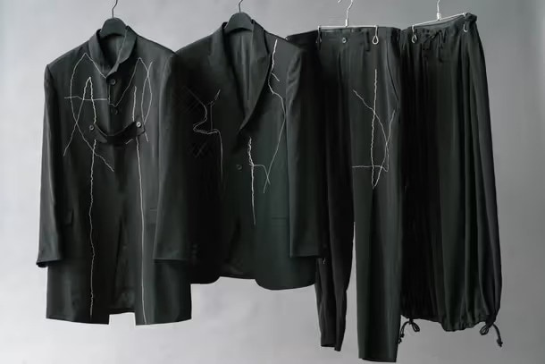 The Yohji Yamamoto Pour Homme Cracked Embroidery collection revisits the brand’s Autumn/Winter 1994–95 “Marionnette” archive, reworking its original silhouettes and motifs into a new capsule. The series focuses on jackets, voluminous trousers, and T-shirts built using the label’s signature oversized and draped patterns. Each garment incorporates a cracked embroidery technique that replicates the appearance of fractured, weathered surfaces, a motif first introduced during the original runway presentation.