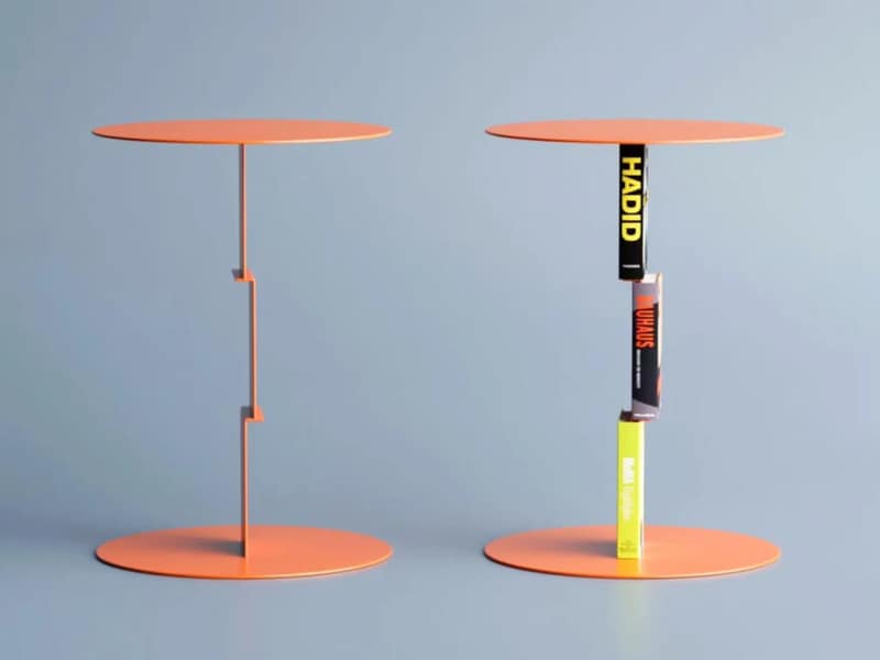 Deniz Aktay’s Delusion Table presents a side table designed to make books appear as the primary structural support. The Delusion Table uses a concealed metal framework that connects the tabletop to the base, while integrated clips hold books vertically along the central column. Once books are inserted, the structural core becomes visually obscured, creating the impression that stacked volumes are carrying the surface above through their own weight and alignment.