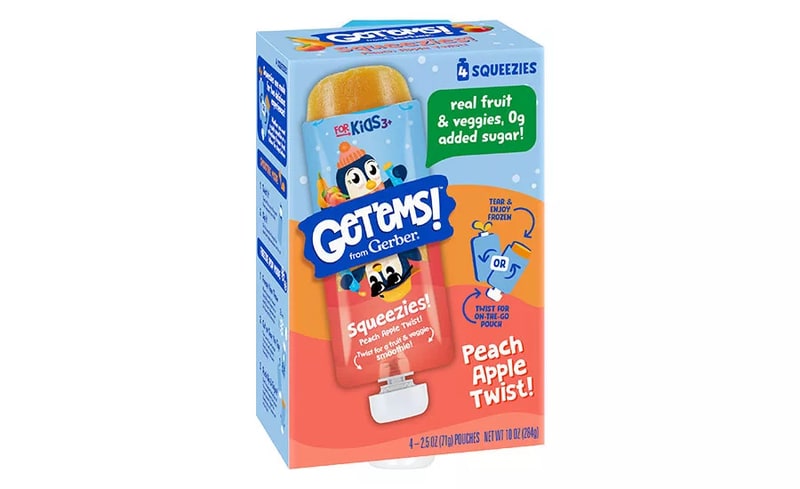 Gerber Get’ems! Squeezies are suited for children aged three and up, and prioritize versatility to work well for a number of family snacking occasions. The smoothies come in boxes of four servings that can either be twisted open at the cap or cup open at the top, depending on the consumption preferences.