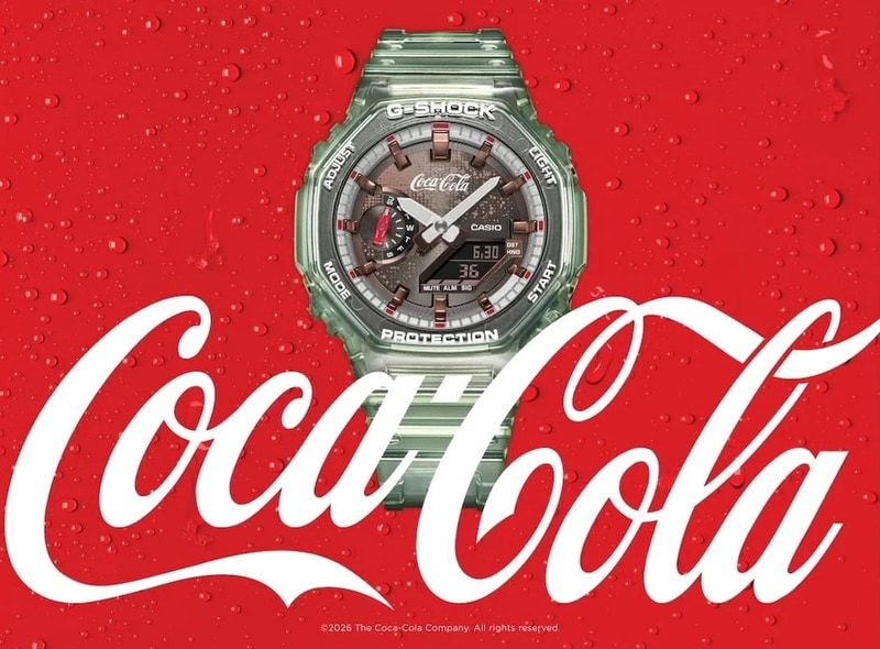 G-SHOCK Coca-Cola anniversary watch is a commemorative timepiece created to mark the beverage brand’s 140th anniversary, translating the contour bottle into a wristwatch format. The design features a curved case and strap that reference the bottle’s silhouette, paired with a glossy red finish that reflects the brand’s established color identity. The dial incorporates Coca-Cola script branding alongside graphic elements derived from historical packaging design.
