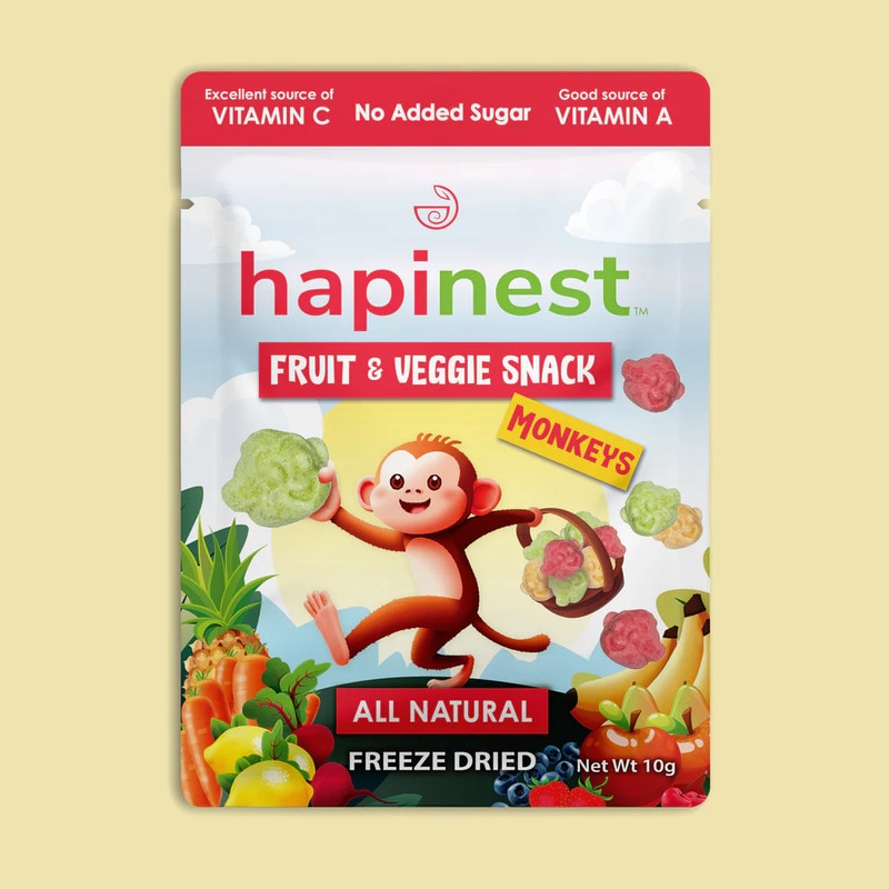 Hapinest's freeze-dried fruit and veggie bites are made only with real ingredients and no added sugar, as seen in the brand's Monkey-shaped snacks. Apple, banana, pineapple, sweet potato, squash, carrots and spinach are just a few of the colorful, vitamin-packed ingredients that power these nutritious, snackable bites.
