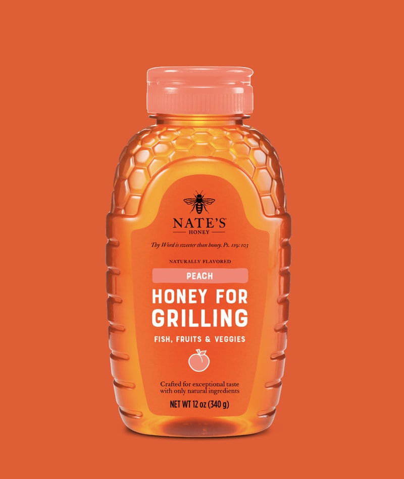 Honey for Grilling by Nate's Honey is made for brushing, drizzling, topping and caramelizing, enhancing grilled proteins, seafood, fruits and vegetables with a bright, summery, juicy peach flavor. This flavored honey with a smooth, fresh finish keeps its ingredient list simple, using only 100% pure honey and natural peach flavor to enhance grillside experiences. Perfect for picnics, backyards and other al fresco dining occasions, this grill-ready flavored honey taps into the demand for sweet-savory flavor experiences and refreshingly different ways to upgrade seasonal comforts.