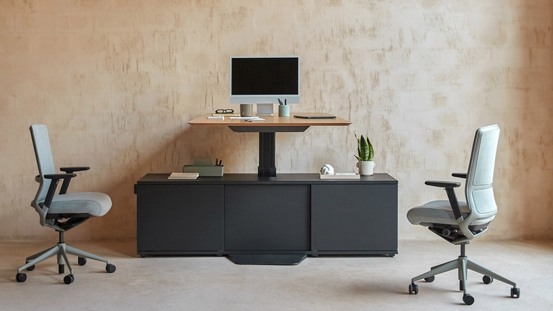 Menssula Sit-Stand Tables by Actiu Use Cantilever Structure & Electric Lift