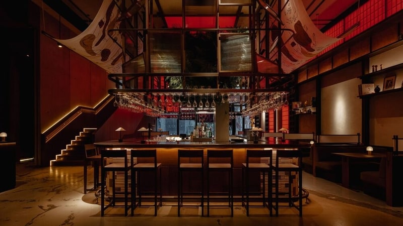 Mitsu restaurant in London, designed by Astet Studio, is located within the Aethos Shoreditch hotel at 50 Willow Street and draws from Japanese izakaya settings combined with urban nightlife references. The entrance features a sequence of LED-lit arches forming a corridor that leads into the main dining space, establishing a controlled transition between exterior and interior. The layout includes a robata grill, bar seating, and a terrace with DJ equipment integrated into the overall arrangement.